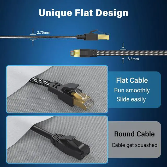 More ConvenientCat 8 rj45 cables are in flat design to avoid tangled cords and save space. Flat Lan cable is super flexible to make it easier to hide or run along any surface. You can easily and immediately install the cable run along walls, follow edges or corners when you receive the durable gigabit ethernet cable.