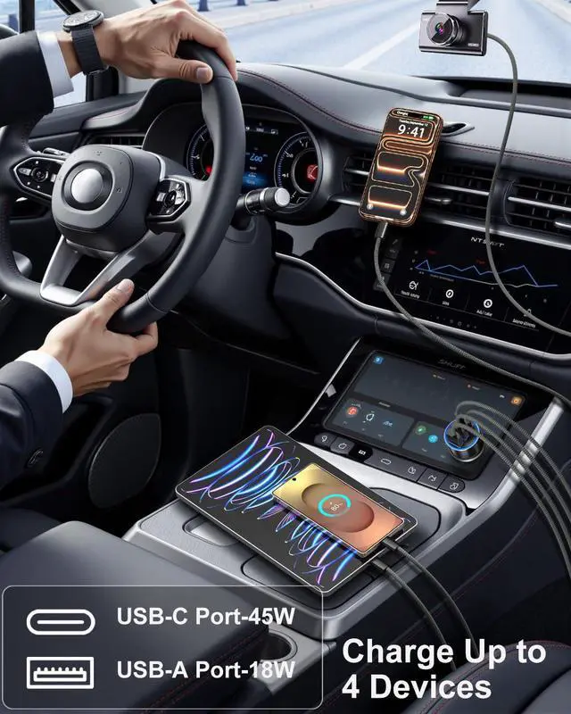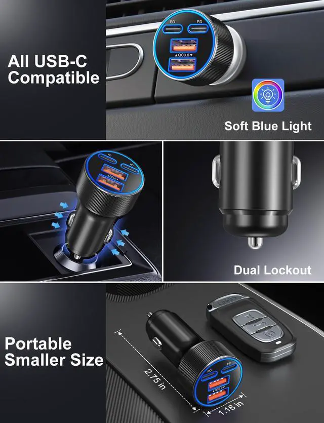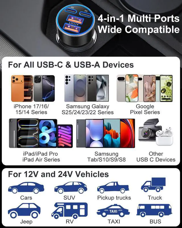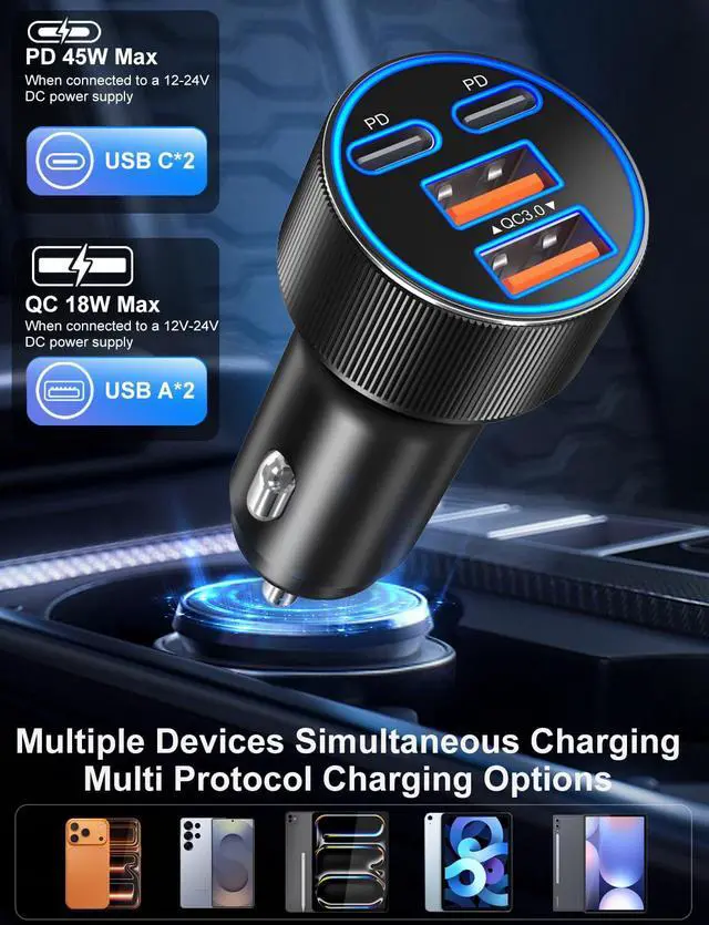 4-in-1 Car Charger Adapter: Feature with 4 charging ports( PD 45W and QC 3.0 fast charging protocol), this multi port car cigarette lighter usb charger charge up to 4 devices at once simultaneously in the car. The latest fast-charging USB-C port for the high power needed devices, like newer iPhone 17 Pro max iPhone 16e and Pads, while USB-A port for the less power required devices, ensuring optimal power distribution across all connected devices without compromising speed or safety.