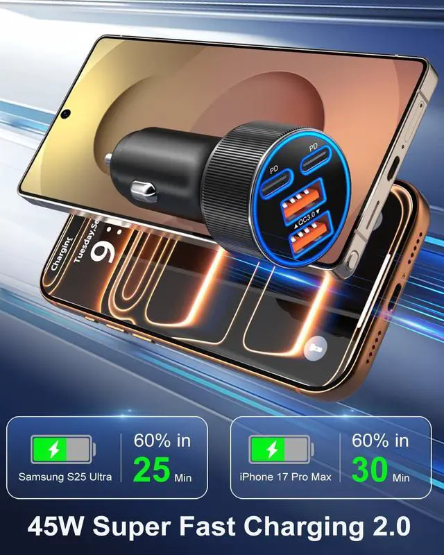 Upgraded 45W Super Fast Charging: Dual USB-C & USB-A car adapter plug with 45W super fast charging 2.0 technology, it can fast charge for you iPhone 17 16 15 14 Series in high speed and PD/PPS super fast charger Galaxy S25Ultra/S24/S23 series and most android phones up to 60% in 30 minutes, largely shorten the car in charging time.