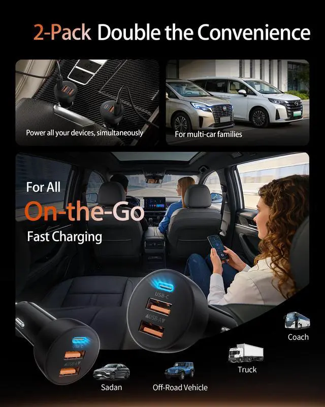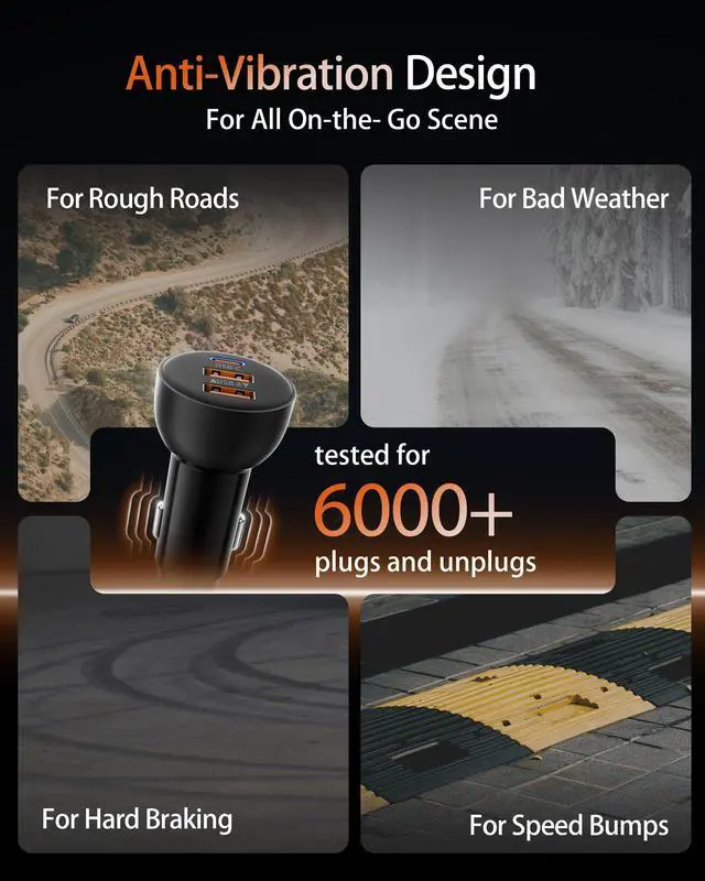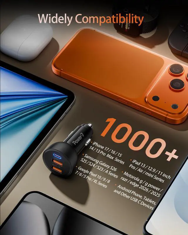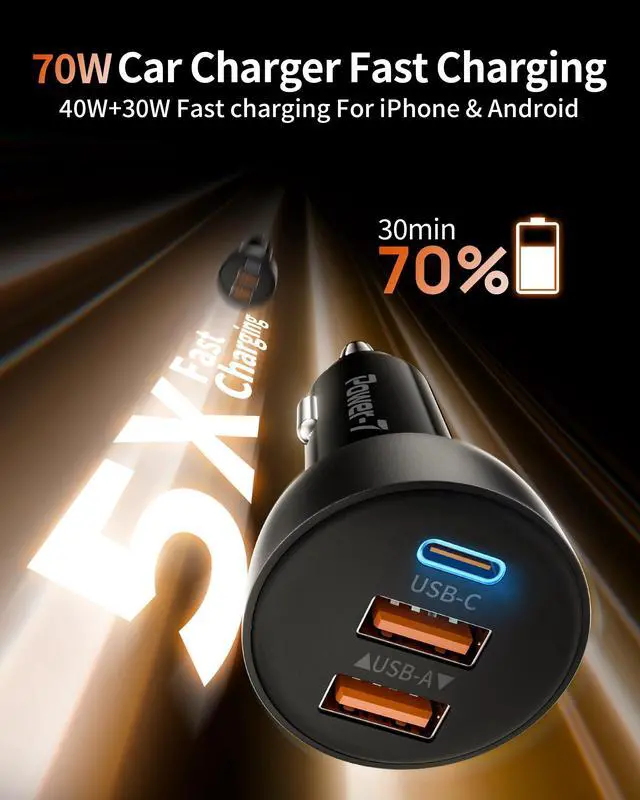 70W Car Charger Fast Charging: Featuring advanced PD and QC fast-charging technology, this USB-C car charger powers your iPhone 17/16/15 to 75% in just 30 minutes and Samsung Galaxy S26/S25/S24 to 70% in just 30 minutes. 5X faster charging speed ensures efficient power on the go. Ideal for quick top-ups during commutes or road trips