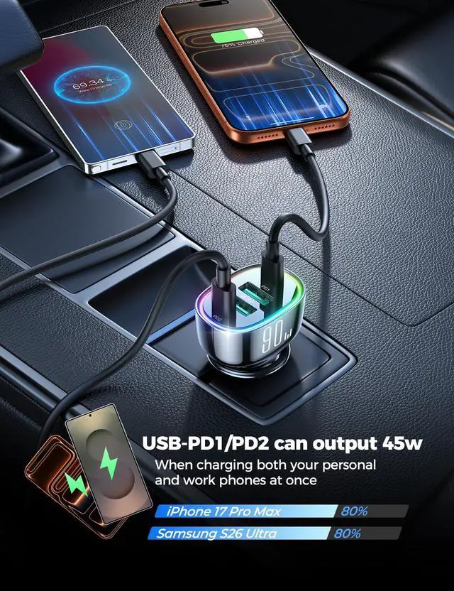 2025 Newest Upgraded 90W(Max) USB C Car Charger Fast