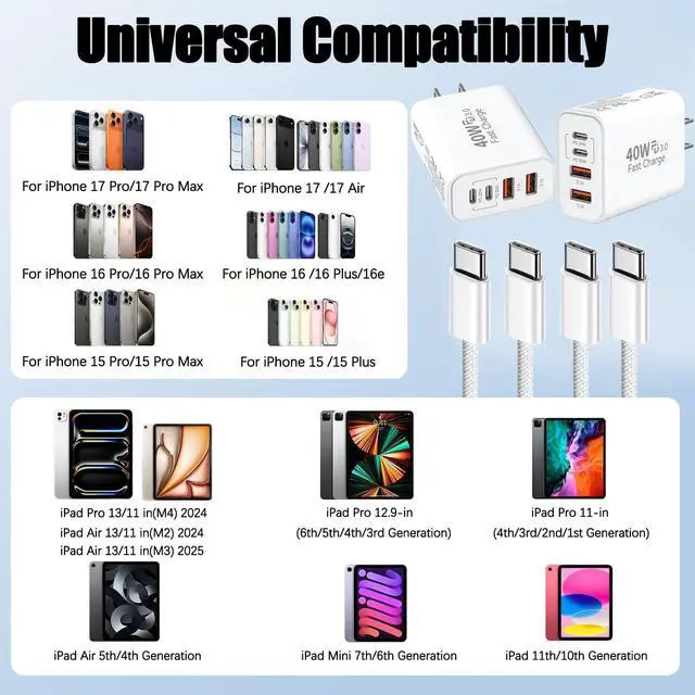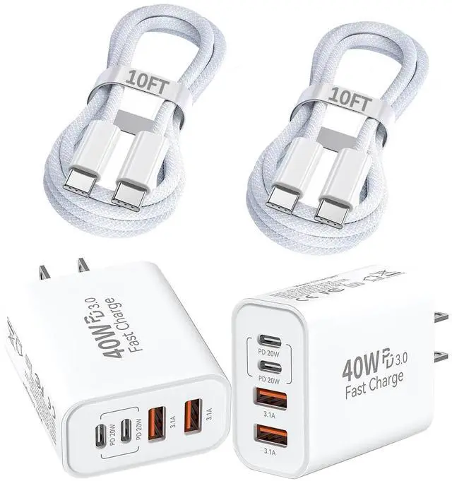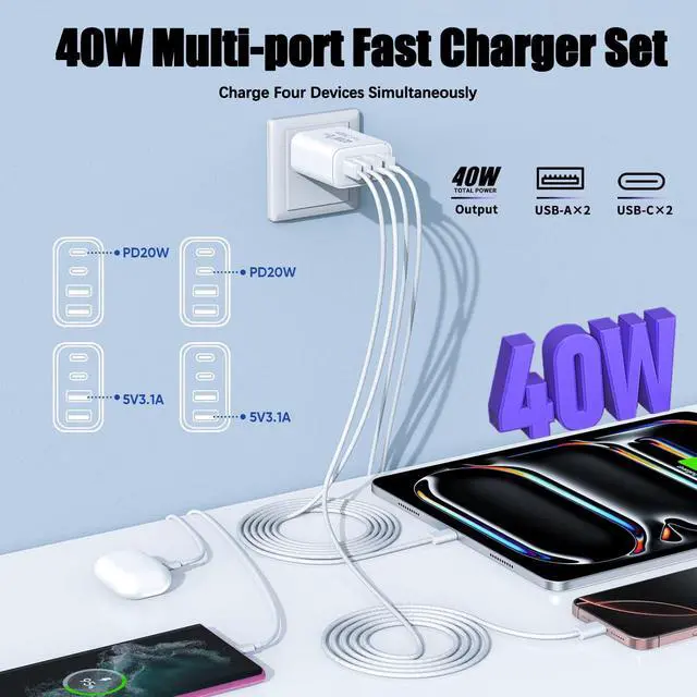 40W 4-in-1 Multiport USB C Fast Wall Charger + 10FT USB-C Woven Cable for iPhone/iPad