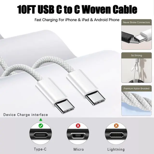 -10FT USB C to USB C woven cable,Let's you can work and charge your tablet or cellphone anyplace.