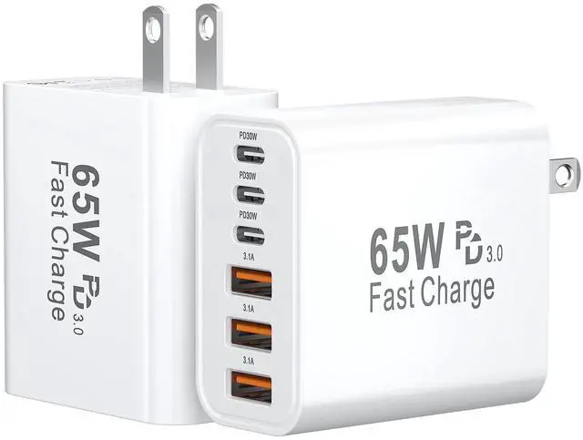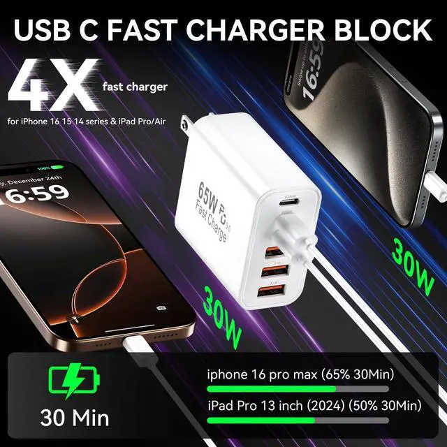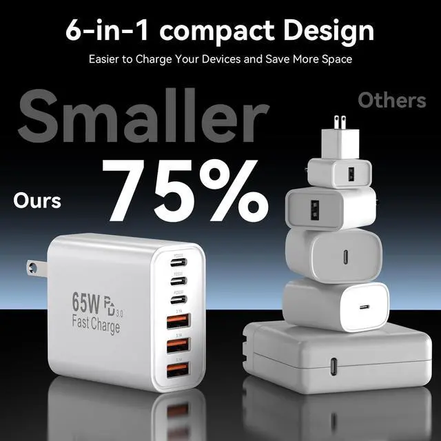 Fast-Speed Charging Block for iPhone 17 Pro Max: The charging blocks deliver 65W GaN-powered efficiency with 3 USB-C and 3 USB-A ports. Each usb c charger block supports 30W PPS/PD 3.0 super-fast charging 68% charge for iPhone 16 or 60% for Galaxy S24 in 30 minutes. Perfect as a fast charging block for flagship devices, outperforming standard 20W charger block models.