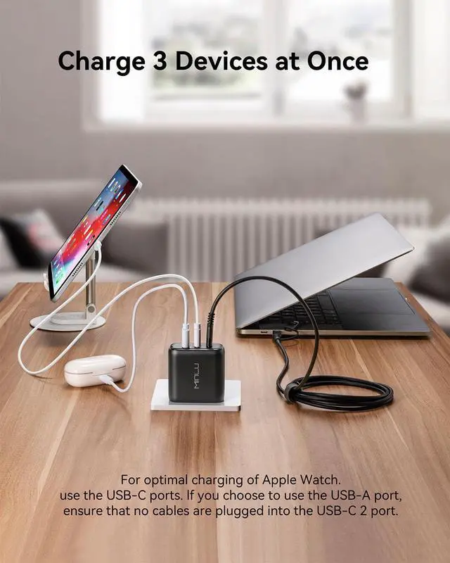 When you connect 3 devices, the top USB-C port can output 40W, the second USB-C port can output 12W, and the USB-A port can also output 12W. That gives you the power you need to charge your notebook, your tablet, and your phone all at the same time.