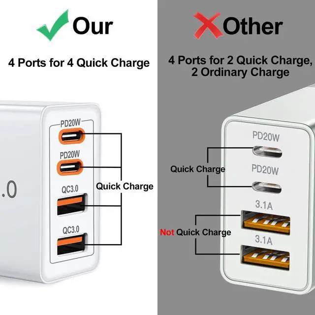 4-ports,the USB charger is compatible with almost all electronic devices,charging adapter for for iPhone,iPad,AirPods,Watch,Samsung,Google Pixel and other digital devices compatible.