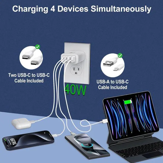 The USB C Charger supports the Power Delivery and Quick Charge 3.0 fast charging functions with a total power of up to 40W. With the ability to use USB-C and USB-A ports simultaneously, power four devices at once without compromising speed or performance