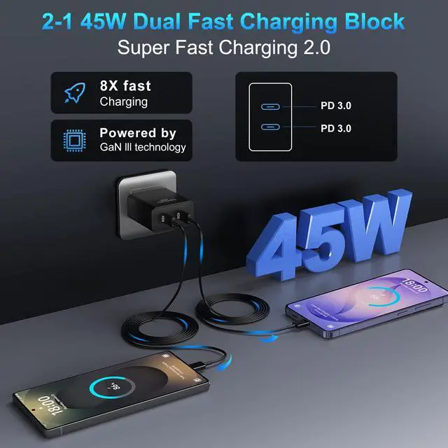 Dual-Port 45W Android Fast Phone ChargerOur samsung super fast type c charger features intelligent load distribution -the two ports provide power 45W output. Charge your S26/S25 Ultra at max speed while powering a Galaxy Tab or laptop without throttling. Perfect for multi-device households and mobile professionals.