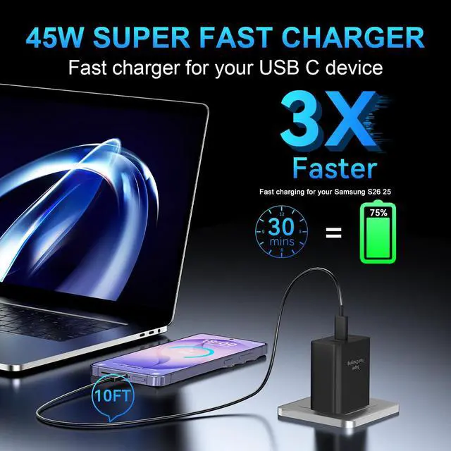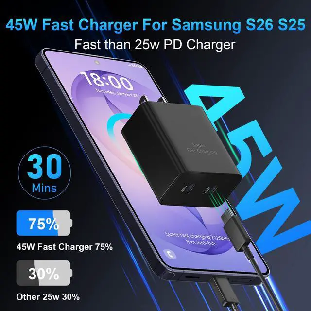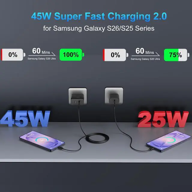 45W for Samsung Super Fast Charging 2.0 for S26/S25 UltraThis 45W for Samsung S26/S25 Ultra fast phone charger charge your S26/S25 Ultra delivers 0-50% battery in 22 minutes and full charge under 60 minutes. Optimized for Galaxy S26/S25 series including S26 Ultra/S26+/S26/S25 Ultra/S25+/S25, the 45W USB-C charger outperforms standard adapters while maintaining cooler temperatures during hyper-fast power delivery