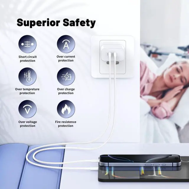Safe and reliable iPhone 17 16 15 Charger block :Our USB C iPhone 16 charger Fast charging prioritizes safety with its comprehensive protection system to prevent overvoltage, overcharge, and overheating. Equipped with advanced smart chips, intelligent current regulation to meet your device needs, ensure your iPhone16/ iphone15 fast and safe charging process.