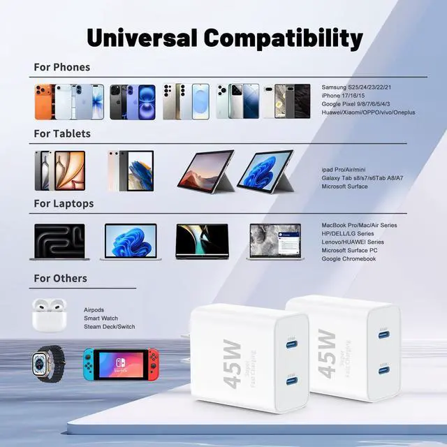 45W iPhone 17 16 15 charger Fast charging :The 45W iPhone 16 Fast Charger USB C Block with the 60W 10ft extra long USB C to USB C Fast Charger cable provides a maximum 45W output power, charging the iPhone 16 Pro Max up to 70% in 30 minutes, six times faster than the original 20W USB C charger. And the 45W charger uses a two-port design, two ports can quickly charge two devices at the same time, up to 45W, up to 45W when a single device is connected.