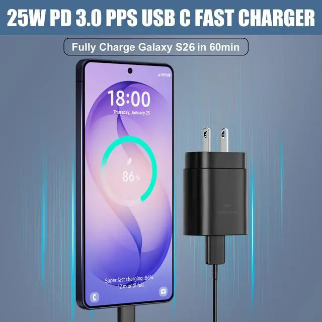25W USB C Fast Charger for Samsung Charger Fast Charging25W PD 3.0 Technology provides Max 25W output power for all Samsung Galaxy S26/S26 Ultra/S26+/S25/S25 Ultra/S25+/S24/S24 Ultra/S24 Plus/S23/S23 ultra/S23 Plus/S22/S22 Ultra/S22+/S21/S21+/S21 Ultra/S20/S20+/S20 Ultra,Fast charge your battery from zero up to 100% in about 60 min,5 times as fast as Standard Charger Block,10 times as fast as PC USB port and saves you time