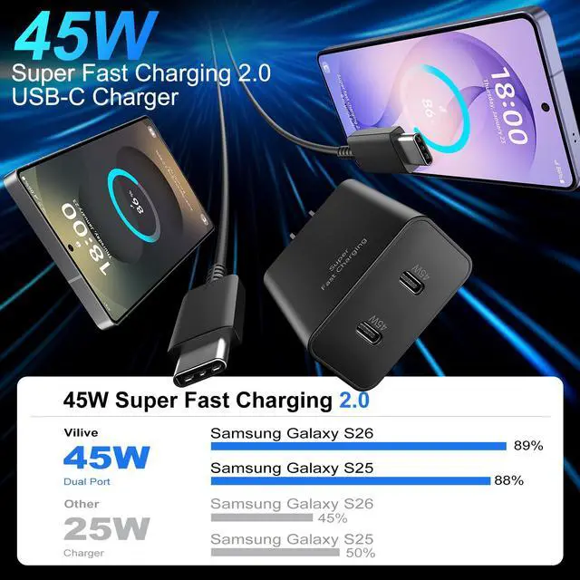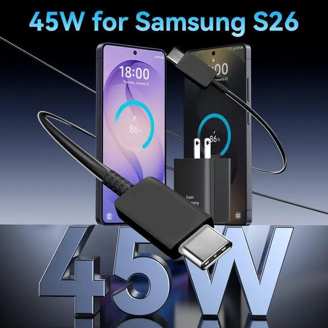 One Charger Fits AllThis portable 45W USB C Fast Charger is broadly compatible with almost any personal devices from phones, tablets to laptops. 45W Super Fast Charging 2.0 is suitable for Samsung Galaxy S26 Ultra/S26+/S26/S25 Ultra/S25+/S25/S24 Ultra/S24/S24+/S23 Ultra/S23/S23+/S21/ S21+/ S21 Ultra 5G/ S22/S22+/S22 Ultra/Note10/ 10+, Note 20/20 Ultra 5G, iPhone 17/iPhone 17 Pro Max/iPhone 17/iPhone Air//iPhone 16/15 Pro Max/ etc.