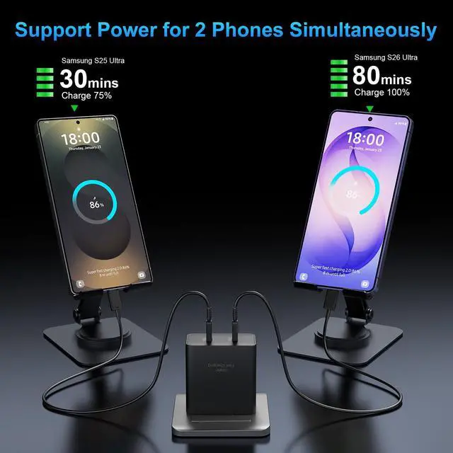 45W Super Fast Charger 2.0Equipped with 2X 45W PPS/PD3.0 USB-C port, 2-port 45w USB-C charger support Super Fast Charging 2.0 and provides maximum power of 45W. You will enjoy unprecedented charging speeds. Say goodbye to long charging period and enjoy its instant power!