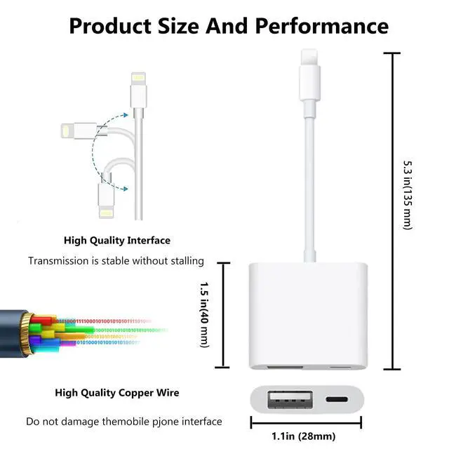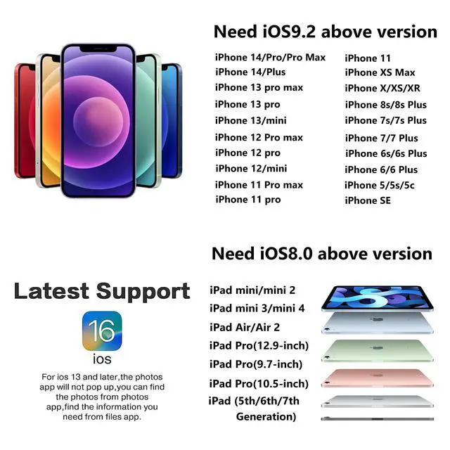 Widely Compatible Our usb adapter supports standard photo formats,including JPER and RAW,and SD or HD video formats,including H.264 and MPEG-4.It is compatible with a wide range of Apple devices, including iPhone 14/14 Plus/14 Pro/14 Pro Max/13/13 mini/13 Pro/13 Pro Max/12/12 mini/12 Pro/12 Pro Max/11/11 Pro/X/XS/XS Max/XR and iPad Air/Mini/Pro. It supports All iOS system , ensuring broad compatibility across Apple devices.