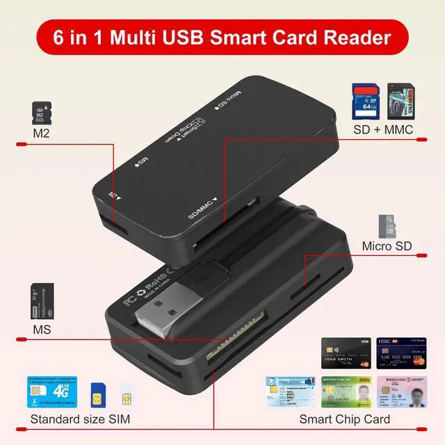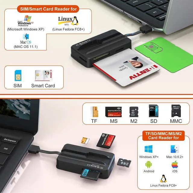 Broad System & Device Compatibility Memory card reader(SD,MMC,TF,MS,M2): Plug-and-play operation requiring no drivers or firmware updates for most systems. CAC/Smart Card/SIM Card Reader Compatible with Windows (Vista/8/10+), macOS (11.1+), and Linux (Fedora FC8+). Works with PCs, laptops, USB-A devices, trail cameras, and more. CCID-certified with an LED connection indicator.