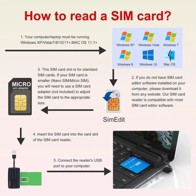 How to Read a SIM Card 1. Ensure you are using a Windows/macOS 11.1+ based computer or laptop. 2. Install a SIM editor program of your choice from a trusted source. This reader is compatible with most common SIM editing applications. 3. Insert your Standard SIM card into the SIM adapter (included in the package), then insert the SIM adapter into the card slot of the card reader. 4. Connect the reader to the computer via the USB port to begin accessing the SIM card data.