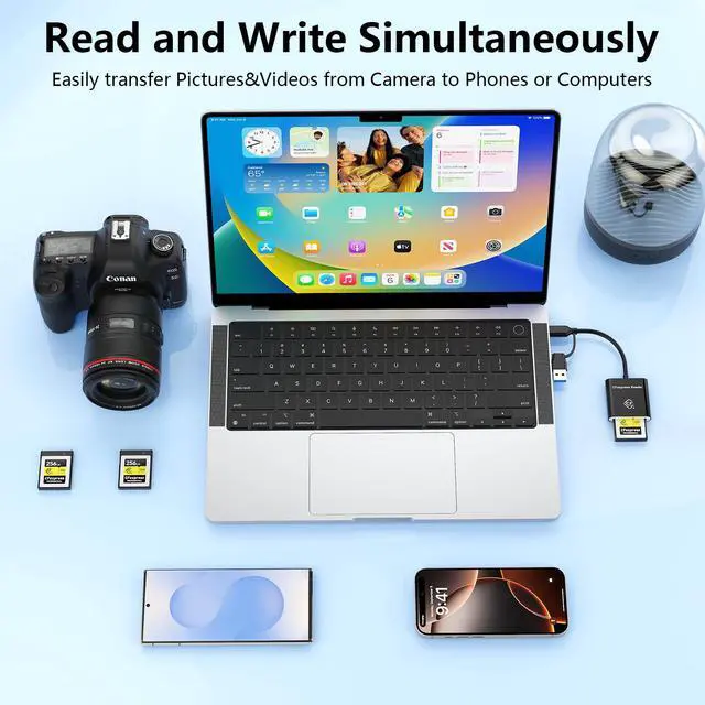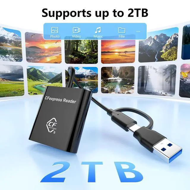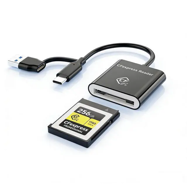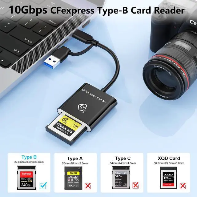 Professional CFexpress Type B Card ReaderProfessional USB C CF express Type B Card Reader Ideal for transferring high-resolution photos and 8K/4K video from Sony, Canon, Nikon, Fujifilm, and other cameras. 10 Gbps high speed Provide great convenience for those who love photography or videography and use CFexpress card