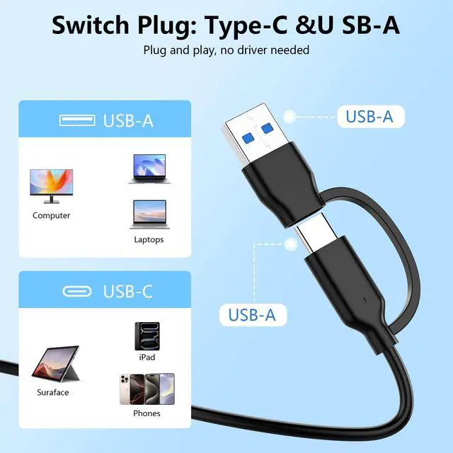 2 in 1 PlugUSB C and USB3.0 Switch connector design provides a more efficient access to laptops, tablets and phones by USB-A or USB-C slot. Plug to play, easy to operate and no extra driver needed. Compatible with most systems--Mac OS, Android, Linux, Chrome OS, Windows XP/Vista/7/8/8.1/10,11,etc.