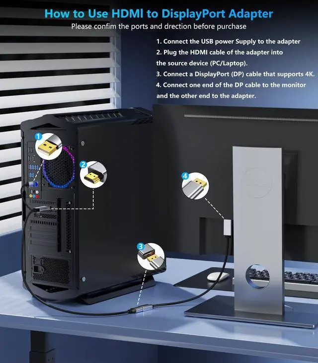 [Plug and play, wide compatibility] This HDMI-to-DP adapter is driverless and plug-and-play. Usage: Insert the HDMI male interface into devices such as computers. Connect the DP interface of the adapter to the DP interface of display devices such as monitors with a DP cable. Insert the Micro USB power port for the best display effect. Note: This is a one-way converter specifically for converting HDMI signal sources to DisplayPort monitors. It does not support DP-to-HDMI or HDMI-to-USB