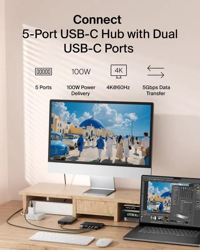 USB C Hub, 5-Port Hub w/ 4K HDMI Display @ 60Hz, 100W Power Delivery, Fast Data Transfer 5Gbps, USB C Multiport Adapter for MacBook, iPad Pro, Chromebook, & More - Upgraded HDMI 2.0