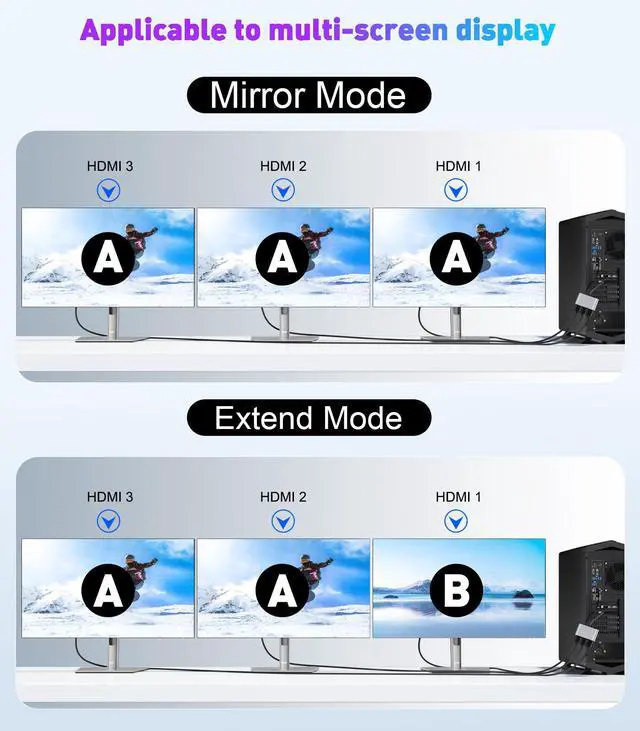 Wide Compatibility: We have adopted top-notch chips, making it compatible with all the devices equipped with DP/DP++/DisplayPort++ source ports on the market, such as desktop computers (HP, Dell, Lenovo), graphics cards (AMD, NVIDIA). It can simultaneously connect to three televisions, monitors and projectors equipped with HDMI ports. (Please ensure that your graphics card supports at least 18Gbps otherwise, you will not be able to achieve multi-monitor extended display)