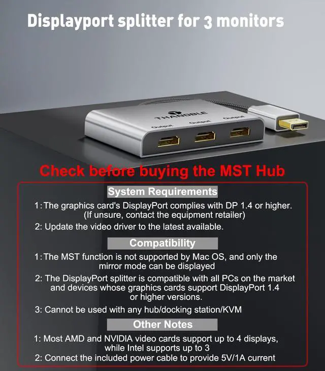 Multi-Screen Display Adapter: THANDBLE DisplayPort to HDMI MST Hub. It can connect your DP device to a maximum of three monitors to drive mirroring and extended modes. It is not compatible with Mac OS system. (Note: PCs with integrated GPUs can only support mirroring mode or can only extend one monitor)