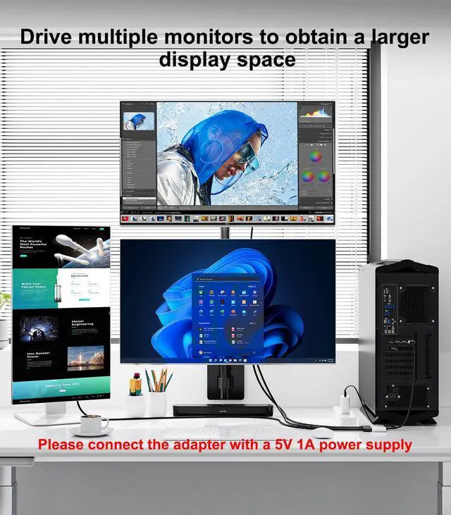 4K Ultra High Definition Resolution: The DisplayPort Splitter for 3 Monitors supports a resolution of up to 4K@60Hz. You can use up to three monitors simultaneously. The vivid images can bring you even more stunning screen colors and contrast. It is also backward compatible with 2K@120Hz/60Hz and 1080P@120Hz/60Hz. (Note: It is required to connect to a 5V 1A power supply interface. The USB C power cord is included in the package)