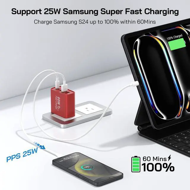 30W USB C Fast Charging Block for iPhone&Sam-sung: Either USB C port supports PPS/PD 3.0 super fast charging functions with a maximum output of 30W, much faster than other 20W ports. Charge your i Phone 16 from 0% to 68% or for Galaxy 25 to 60% in just 30 minutes. Note: The multi port charging brick can only support single USB-C super fast charging.