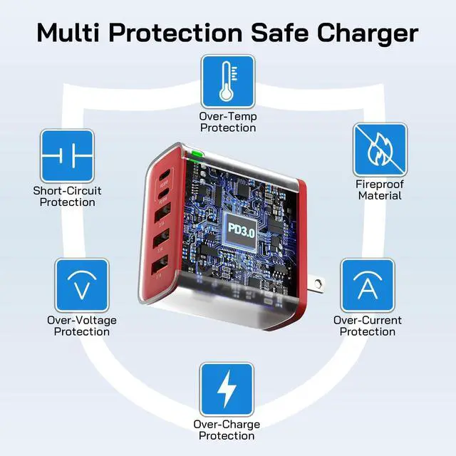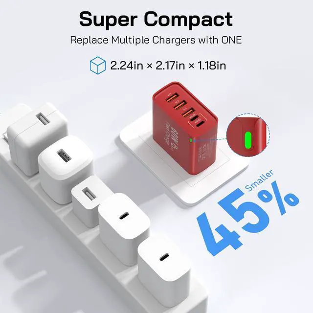 5-in-1 USB C Wall Plug: One usb c charging block has 2 USB C ports and 3 USB A ports. When you connect 5 devices, the usbc charger with a maximum output of 60W power will be distributed efficiently between ports to ensure you get the best charge to minimize waiting time. It's also a great space saver instead of taking up 5 wall outlets.The usb c cube with an LED indicator to show the charging status, and the green light indicates that the charger is charging.