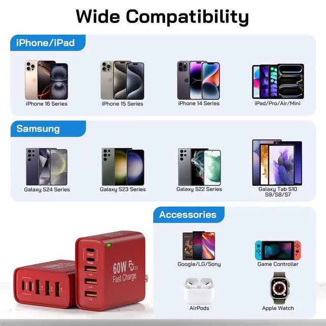One for All: Due to the special 5 port, the rapid charging block is compatible with almost all electronic devices, adapter for iPhone 17 /17 Air/17 Pro /17 Pro Max/16/16 Plus/16 Pro/16 Pro Max/15/15 Plus/15 Pro/15 Pro Max/14/14 Plus/14 Pro/14 Pro Max/13/13 Pro/13 Pro Max/13 Mini/ 12/12 Pro/12 Pro Max/12 mini/11/11 Pro/11 Pro Max/XR/XS/X/8/7, i Pad Pro/ Air /Mini, for Galaxy S26/S25/S24/S23/S22/S21/S21+/S21 Ultra/ S20/ S20 Ultra/S20 FE, Note 10, Note 20/ 20 Ultra/ S10, for Galaxy Z Fold 3, A53, A71, Tablets, L G, Pixel and more.