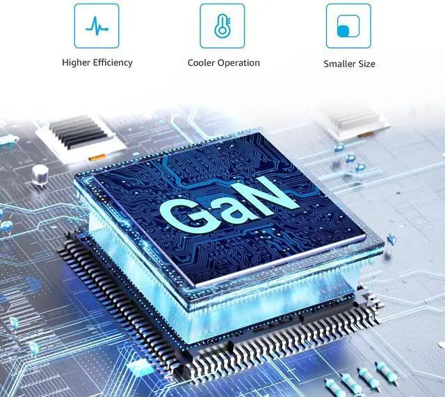 GaN technology: GaN components waste less power and produce less heat (compared to silicon), which results in a more efficient charge