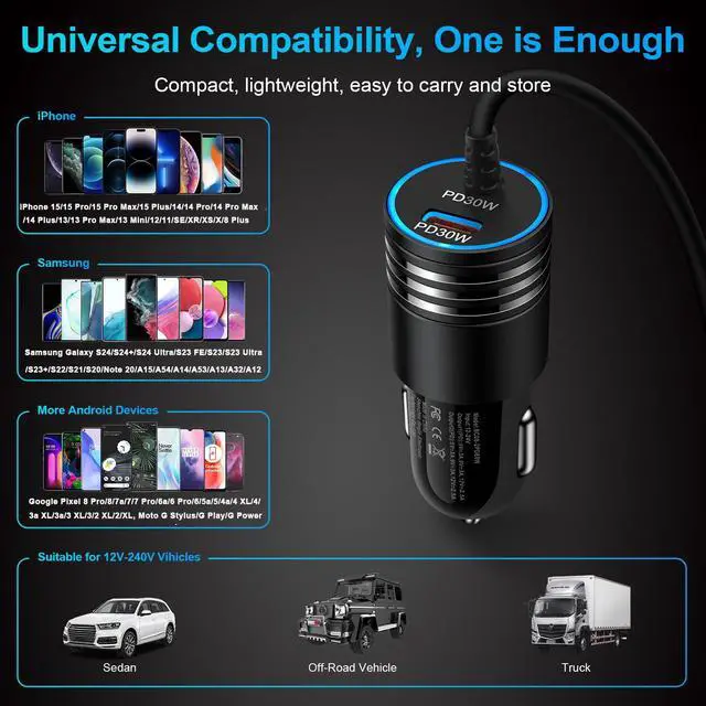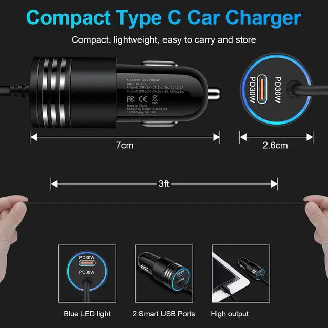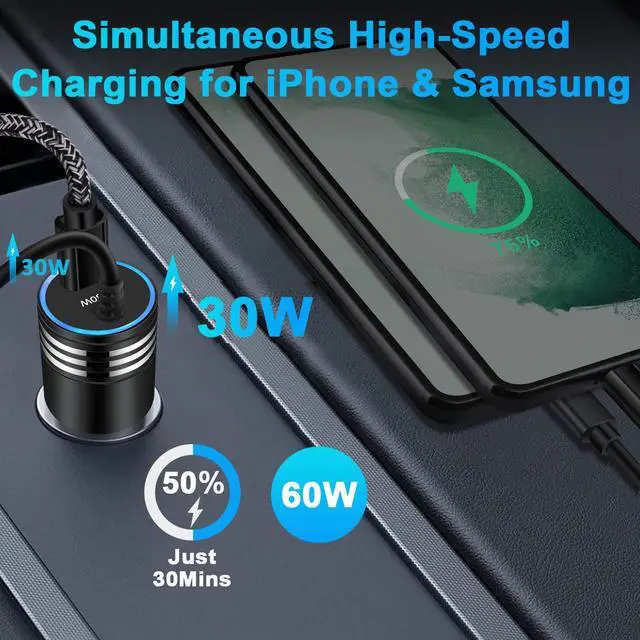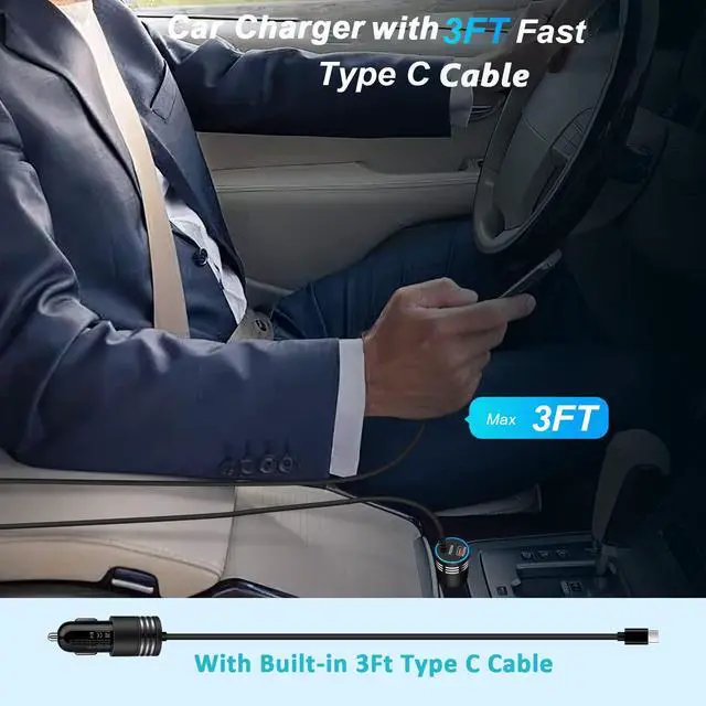 60W Super Fast Charging USB C Android Samsung Car Charger With Built-in 30W 3ft Type C Fast Charging Cable