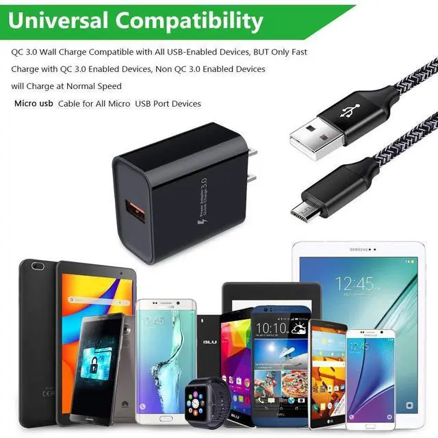 Quick Charge 3.0 Wall Charger with Fast Charging Micro USB Cord Android Fast Charger Combo Kit