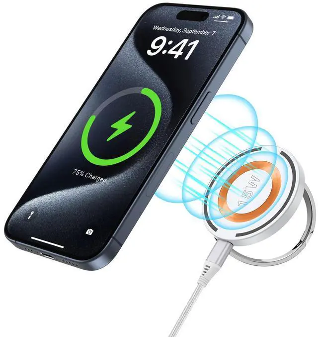 • Strong Magnetic SuctionThe built-in strong magnet of the iphone 15 wireless charger fast charging pad makes the charging snap. Put the charging pad close to the back of the phone, it will automatically and precisely adsorb and start charging immediately. ( Note: Regular phone cases aren't supported. Please use a mag phone case or bare phone to experience the best charging results, as ordinary thick cases will weaken the magnetic adsorption.)