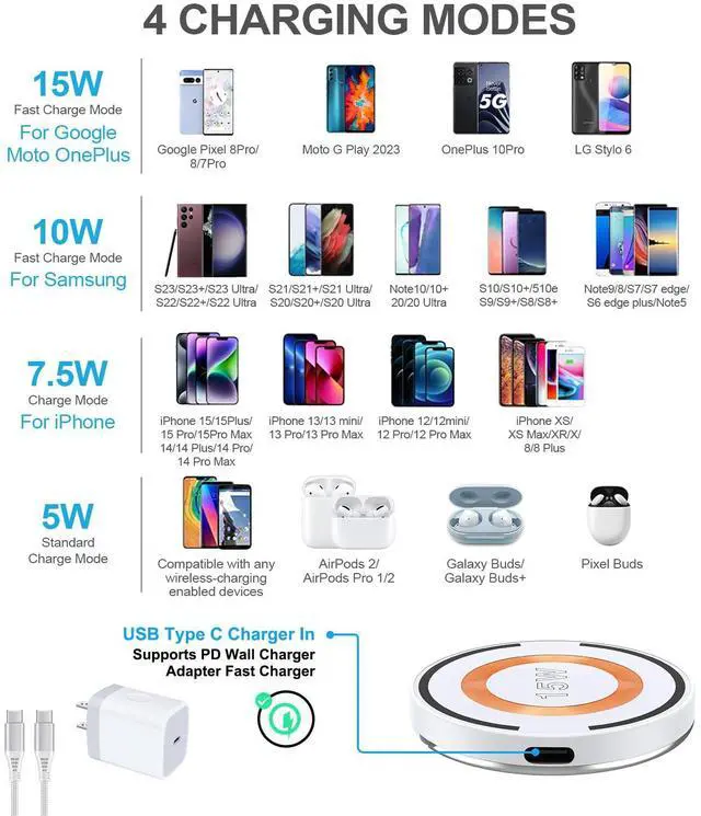 • 4 Charging modes Available for Different Phones:7.5W iphone wireless charge is for iPhone 15/15Plus/15Pro/15Pro Max/14/14 Plus/14 Pro/14 Pro Max/13/13 Pro/13 Mini/13 Pro Max/12/SE 2020/11/XS/XR/X/8 with latest iOS System; 10W samsung charging pad is compatible with Samsung Galaxy S24/S23/S23 Ultra/S23 Plus/S22/S21/S20 Series; 15W Google charging station is compatible with Google Pixel 8Pro/8/7Pro/7/6,5W works on Any wireless charging enabled devices like wireless earbuds (including AirPods).