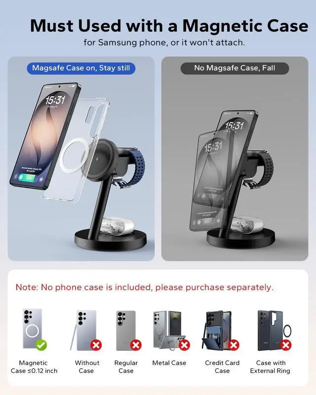 Yes, the 3 in 1 Charging Station for Samsung requires a magnetic case to properly align and attach for Samsung phones, because Samsung phones don't have built-in magnets like iPhones.