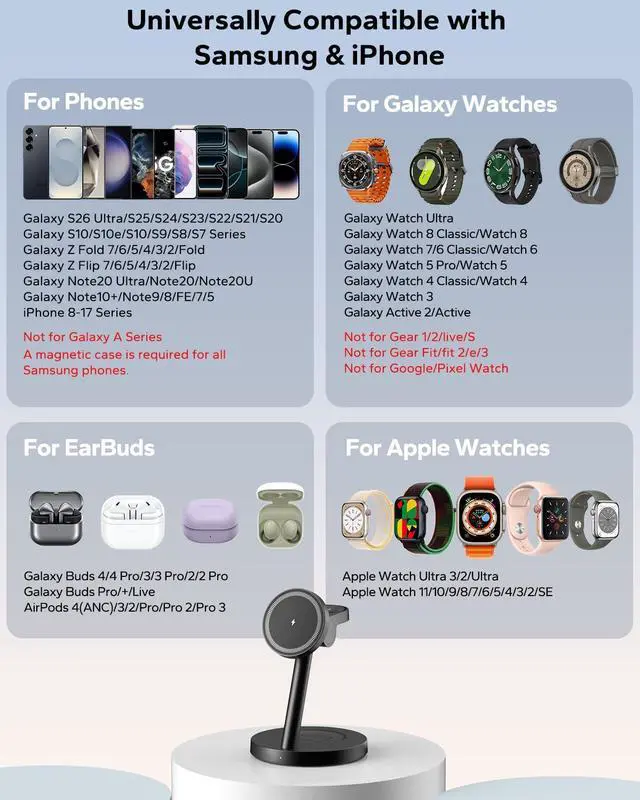 Yes, the magnetic wireless charger for Samsung is designed specifically for Samsung devices and Apple. As for the watch charger stand, please make sure to flip it to choose the right charging side for your watch. (NOT for other Android smartwatches)