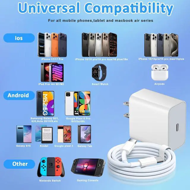 Fast Charging Compatibility iPhone 17 16 Pro Max Charger: compatible for iPhone 17 Pro Max/17 Pro/17 Air/17, iPhone 16 Pro Max,/ iPhone 16 Pro/ iPhone 16/ iPhone 16 Plus, also for iPhone 15/ iPhone 15 Plus/ iPhone 15 Pro/ iPhone 15 Pro Max, iPad Pro 11 inch 4th/ 3rd/ 2nd/ 1st, iPad Air 5/4th, iPad Mini 6th, iPad 10th Generation.and Galaxy S24 Ultra/S24+/S24/S23.(Not compatible with iPhone 14/13/12/11)
