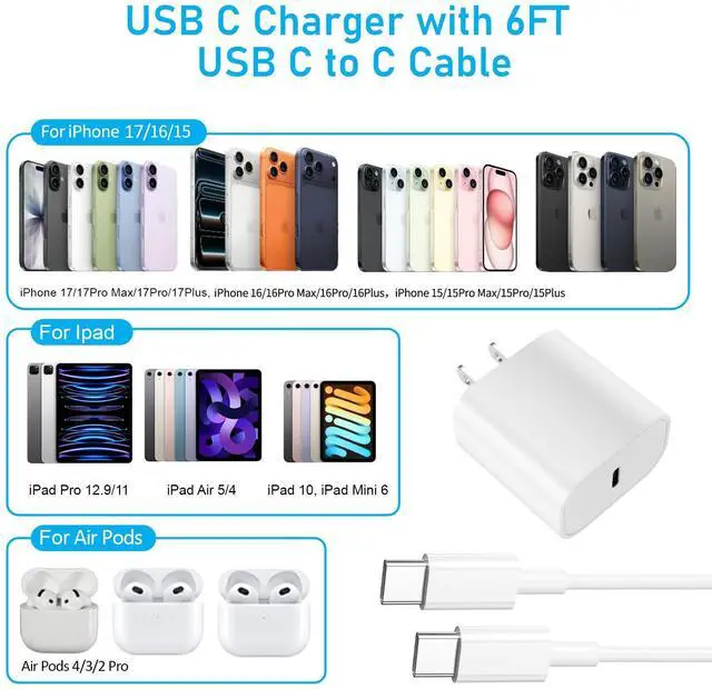 2Pack USB C Fast Charger--for i Pad Fast Charging Wall Charger Block Adapter with 6ft Extra Long USB C to C Charging Cable Cord