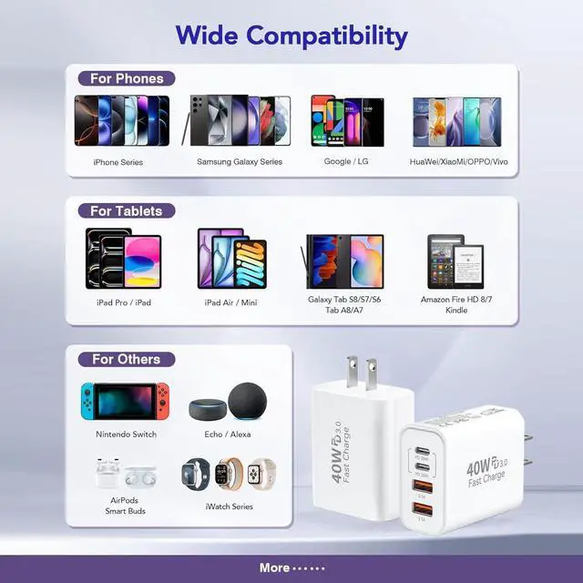 -4-in-1 charger plug maximum total output up to 40 watts.USB-C port supports a maximum power output of 20W,Apple Charger for iPhone 17/16 from 0% to 60% in only 30 minutes.It's 4X faster than a 5W charger block.