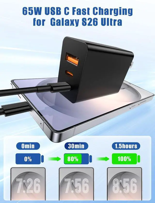 100W USB C Fast Charging for Samsung Galaxy S26 – Visualized Timeline.? A clear, graphical timeline shows the rapid charge progression: from 0% (0 min)? to 70% (30 min)? to a full 100% (1.5 hours), charging efficiency.