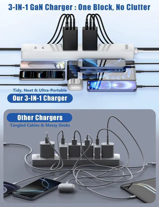 3-IN-1 GaN Charger: One Block, No Clutter.? A lifestyle shot contrasts the sleek, single-block solution (Our 3-IN-1 Charger) against a messy tangle of multiple plugs and wires (Other Chargers), showcasing its space-saving and cable-management benefits.