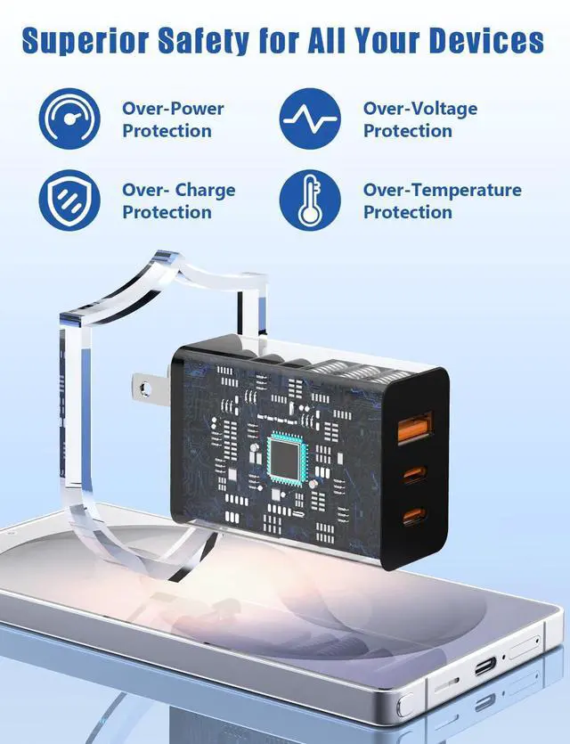 Built-in Superior Safety.? A transparent shield overlays the charger, symbolizing robust protection. Detailed icons list the four key safeguards: Over-Voltage, Over-Temperature, Over-Power, and Over-Charge Protection, ensuring your devices are secure during every charge.
