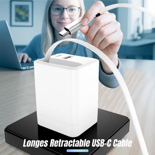 Auto-retractable mechanism: 65cm cable extends and retracts smoothly, keeping desks and bags tangle-free. Just pull to charge, push to retract.