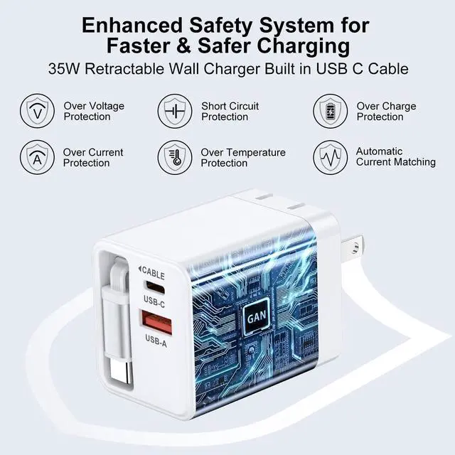 35W Retractable Wall Charger Adapter cargador para features USB C & USB A port and Type C Cord, free you from messy chargers for various interfaces, can charge 3 devices at the same time.