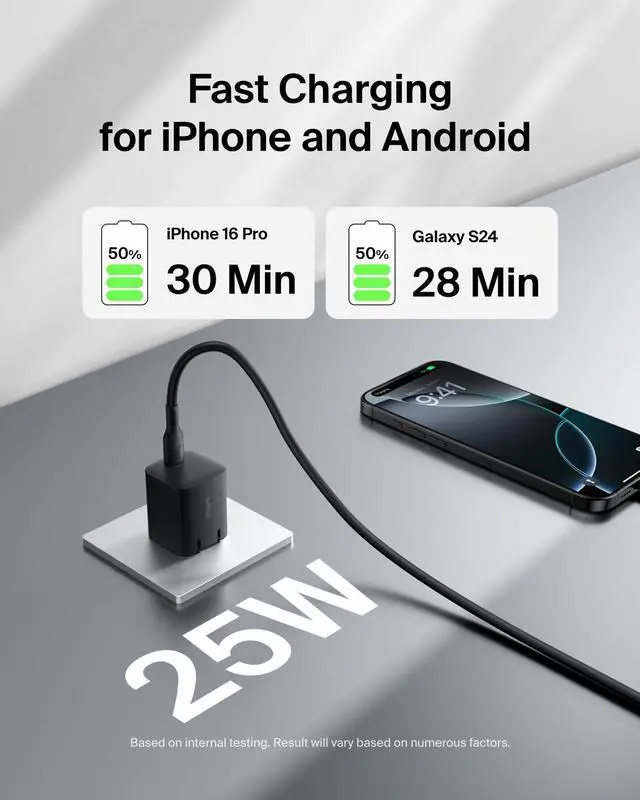 FAST CHARGING TECHNOLOGY: This 25W USB-C Wall Charger fast charges an Apple iPhone 16 Pro or Samsung Galaxy S24 from 0-50% in 30 minutes or less, as well as efficiently charging various other USB-C compatible devices.