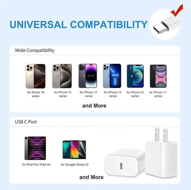 Fast charge your for Apple iPhone 16/ iPhone 16 Plus/ iPhone 16 Pro/ iPhone 16 Pro Max/ iPhone 15 / 15 Pro / 15 Pro Max / 15 Plus / 14 / 14 Plus / 14 Pro / 14 Pro Max / 13 / 13 Pro Max / 13 Mini / 12 / 12 Pro Max / 12 Mini / SE / 11 / XS / XS Max / XR / X / 8, Pad, AirPods, Samsung Galaxy S22 / S21 / S20 / S10 / S9 / S8, Note 20 / 10 / 9 / 8, A10e / 12 / 32, Google Pixel 7/ 7Pro / 6 / 5 / 4a / 4XL / 4 / 3a / 3XL / 3 / 2 or other devices that support USB-C Power Delivery.