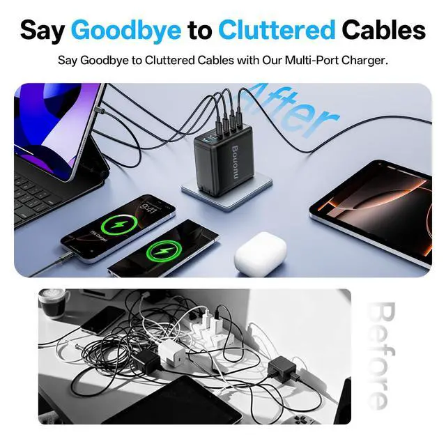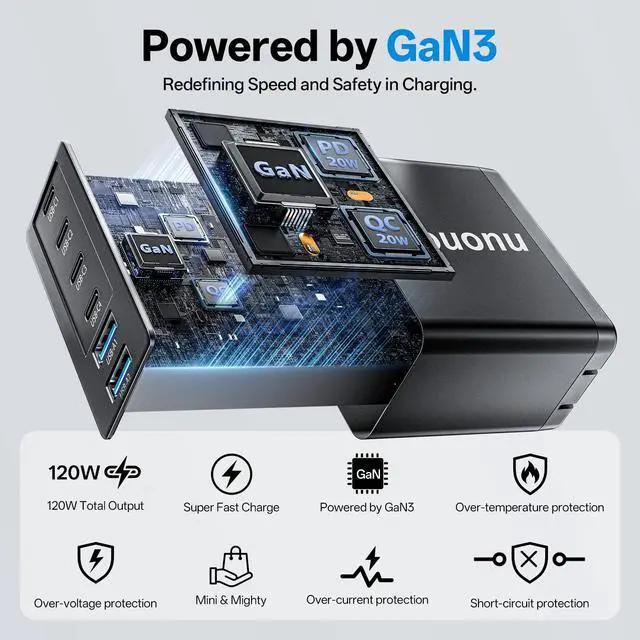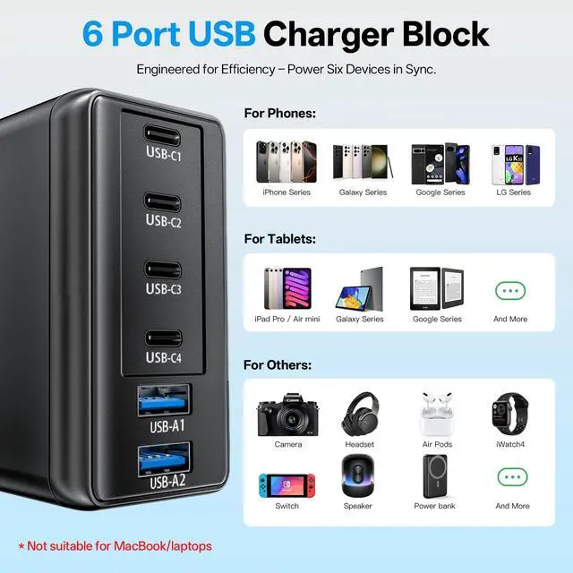 6 Ports Type C Charger for Multi-Device ChargingWith 4 USB-C ports and 2 USB-A ports, this USB C charger block delivers a total of 120W power, allowing you to charge multiple devices simultaneouslywhether it's your phone, tablet, or other gadgets. * Not suitable for MacBook/laptops