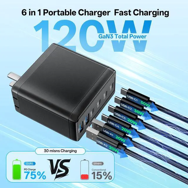 120W Fast-Speed ChargingOnly 30 minutes, charge your phone to 75%. 6 in 1 Charging blocks with 4 x USB C PD 3.0 port (30W max), 2 x USB port(20W max), this charger supports a maximum output of 120 watt in total.